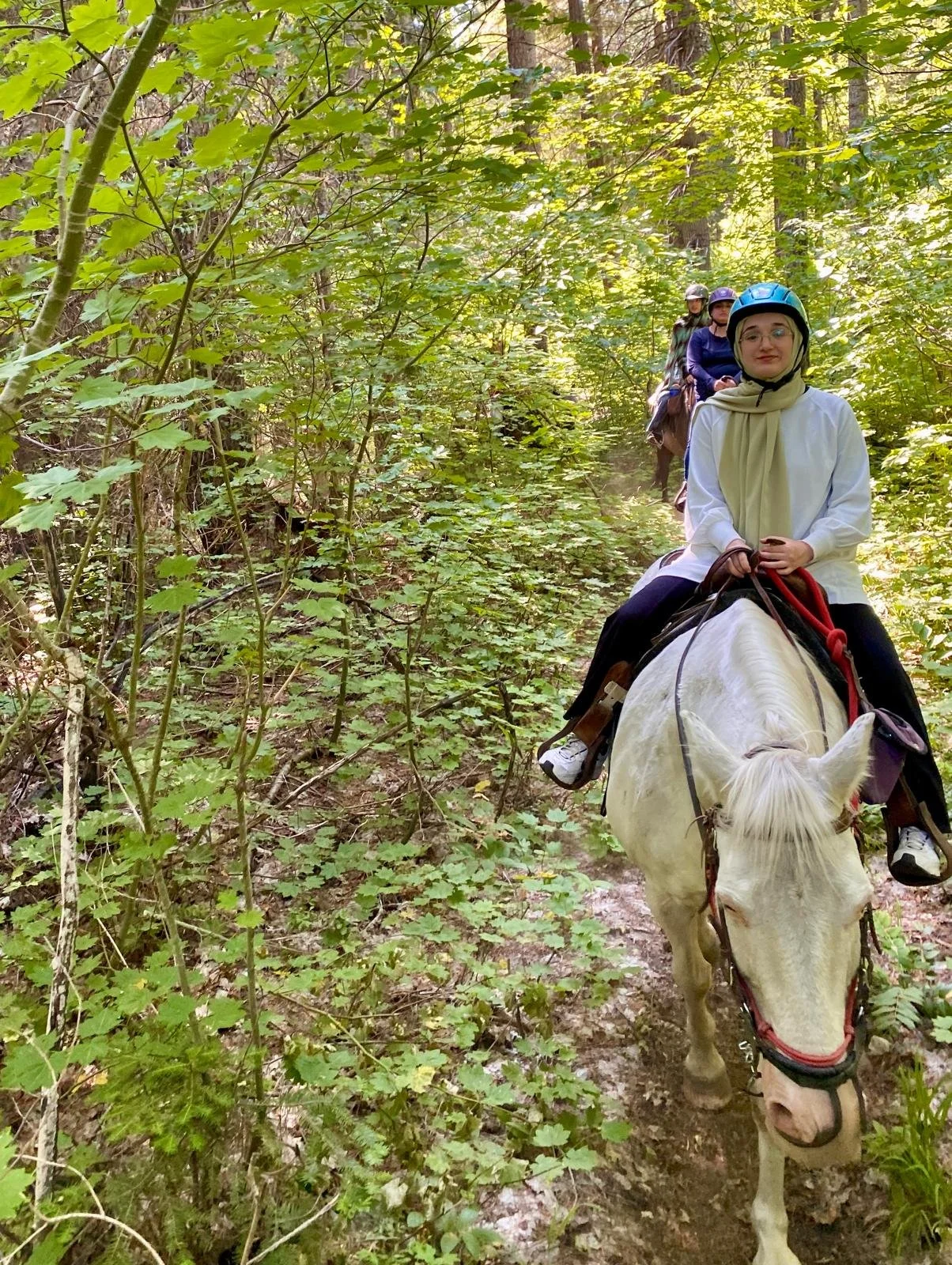 After driving over mountain passes and seeing the remaining snow patches atop high peaks, our group of ladies arrived at Wild at Heart Horse Rides in the foothills of the Cascade Range. As we nourished our bodies over deli sandwiches and a perfect light breeze, trip guide and Equestrian Safa Peera opened up about what horseback riding means to her. She shared stories of her connection to horses, taught our group about the Sunnah of being on horses, and recited the dua for riding on horses. Others shared about what horses have taught them about themselves and their relationship to our Creator. Amidst the sounds of horses naying and saddles being mounted in the background, we readied ourselves for our journey ahead.